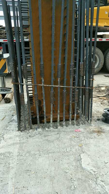 2、為提高工效,在加工場(chǎng)區(qū),將鋼套筒與鋼筋連接,完成擠壓頭的一半,在現(xiàn)場(chǎng)擠壓另一半,但半成品要架起放置,防止擠壓筒內(nèi)被污染。